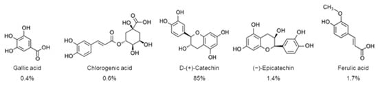 Overall, the POE biological effects have been related to the synergistic action of its individual constituents. A first UPLC characterization analysis showed that POE consists of 88% phenolic compounds, mostly represented by D-(+)-catechin, and less by gallic acid, ferulic acid, (−)-epicatechin, and chlorogenic acid [8] (Figure 1).