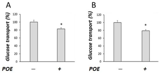 As shown in Figure 2, POE treatment significantly (p < 0.05) decreased glucose transport, both in the presence (Figure 2A) and absence of sodium (Figure 2B).