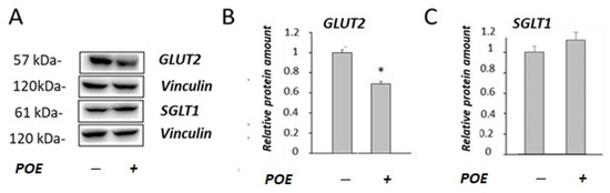 Effect of POE on the levels of glucose transporters. (A) Representative Western blot images of (B) GLUT2 and (C) SGLT1 glucose transporters in differentiated Caco-2 cells incubated in the absence or presence of POE (15 µg GAE/mL) for 24 h. Densitometric data are normalized to the Vinculin expression levels. Data are presented as the mean ± SD of three determinations. *: p < 0.05.