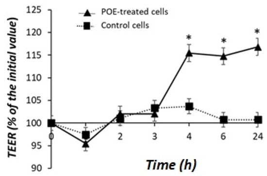 As shown in Figure 4, POE treatment caused an increase in TEER across the Caco-2 cell monolayer. The effect was significant (p < 0.05) after 4 h and reached 118% of the initial value after 24 h of incubation compared with control cells.