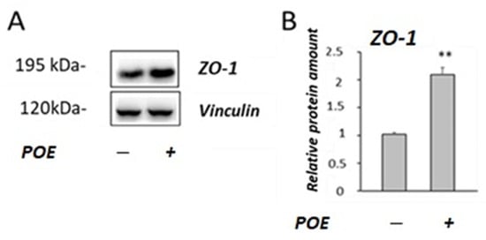 Zonulin-1 (ZO-1) is a protein bound to the cytoskeleton and it has a pivotal role in tight junction (TJ) integrity. Therefore, to investigate the molecular mechanisms involved in the POE-induced increase in TEER, the levels of ZO-1 were determined by Western blot analysis (Figure 5A).