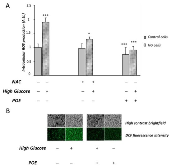 Effect of POE and N-acetylcysteine (NAC) on HG-induced intracellular ROS formation. (A) Intracellular ROS production was evaluated in Caco-2 cells incubated in the absence (control cells) or in the presence of high-glucose conditions (HG cells) for 1 week and co-incubated with POE (15 µg GAE/mL), and N-acetylcysteine (NAC) (50 µM) for the last 24 h. Values are represented as the mean ± SD of five determinations carried out in triplicate. *** Control vs. HG; * HG vs. HG + NAC; *** HG vs. POE; *** HG vs. HG + POE. (ANOVA: *: p < 0.05; ***: p < 0.001). (B) Fluorescent cells observed under a fluorescent microscope in the presence of POE (15 µg GAE/mL (Lionheart™ FX)).
