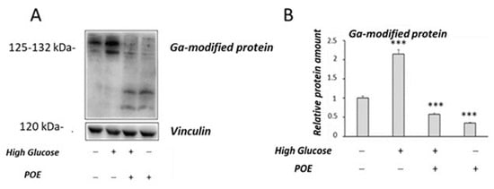 In this study, the glycolaldehyde (GA)-modified protein levels were also evaluated by Western blot analysis (Figure 7A) to investigate the effect of POE on AGEs formation in HG-treated cells. Higher levels of GA-modified proteins were observed in HG cells compared to control cells (Figure 7B), as previously described [20]. In the presence of POE, a significant (p < 0.05) decrease in GA-modified protein levels was observed in HG cells compared with untreated HG cells (Figure 7B). A slight decrease in the GA-modified protein levels was also observed in Caco-2 cells treated with POE compared with the untreated control cells (Figure 7B).