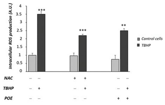 As shown in Figure 8, TBHP induced a more than three-fold increase in intracellular ROS production with respect to control cells (p < 0.001). NAC was able to reduce intracellular ROS production in TBHP-treated cells (p < 0.001). POE showed a comparable effect to NAC in TBHP-treated cells (Figure 8).