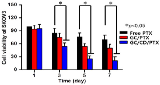 Changes in the cell viability of in vitro SKOV3 cell lines at 1-, 3-, 5- and 7-days post-treatment with PTX only, glycol chitosan hydrogel (GC) combined with PTX (GC/PTX) and GC/PTX complexed with beta-cyclodextrin (β-CD) (GC/CD/PTX). The error bars show mean ± SD with n = 3 and * p <0.05 [52].