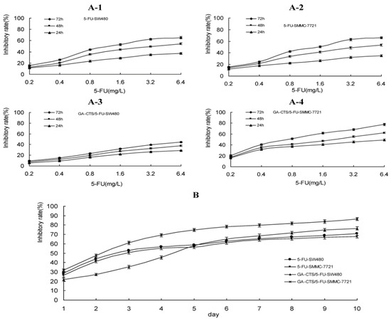 GA-CTS/5-FU and 5-FU cytotoxicity on mouse liver cells SMMC-7721 and SW480 measured by methyl thiazolyl tetrazolium (MTT) assays. (A1–A4) GA-CTS/5-FU and 5-FU inhibition after 24, 48, and 72 h in vitro are observed by varying the concentration of 5-FU (mg/L). (B) The same treatment with 1.6 mg/L of 5-FU after 1 to 10 days. Data are presented as mean ± SD (n = 3) [63].