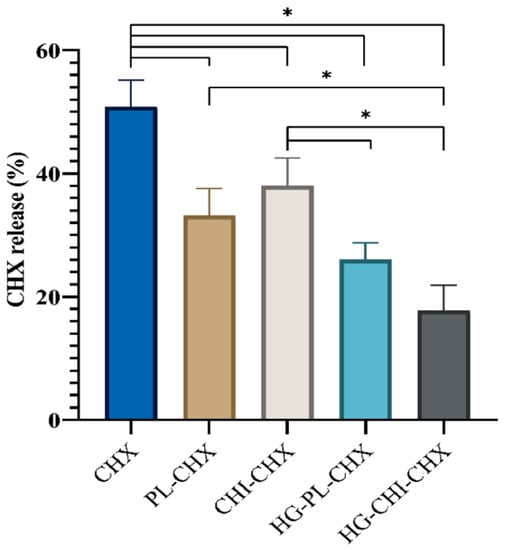 The percentage release (based on the initial concentration) of formulated and free CHX at 32 °C after 24 h when using the Franz diffusion system. CHX = dissolved CHX, PL-CHX = plain, CHX-vesicles, CHI-CHX = CHX-chitosomes, HG-PL-CHX = plain, CHX-vesicles in hydrogel, HG-CHI-CHX = CHX-chitosomes in hydrogel. Since dissolved CHX permeated faster, it showed the greatest percent release. Data are presented as means ± SD (n = 3). * p < 0.05 [73].
