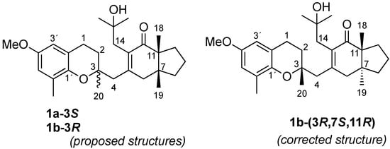 From the methanolic extract of SM, the n-hexane soluble fraction was separated by flash column chromatography and then purified by HPLC to obtain one of the epimers at position 3. The 950 MHz NMR spectra collected in CD2Cl2 did not show any evidence of epimerization for compound 1b. We observed the epimerization of the pure compound in CDCl3 after 25 min. The high resolution mass spectrum showed peaks at m/z 441.2969 ((M + H)+), 463.2811 ((M + Na)+), and 903.5741 ((2M + Na)+), thus confirming the molecular formula C28H40O4. The 1H NMR spectrum of 1b (Table 1) was then assigned in CD2Cl2, showing a singlet signal at δH 3.701, corresponding to the methoxy group attached to the aromatic nucleus. Two doublets, at δH 6.563 and 6.450, were assigned to aromatic protons, a harmonious relationship then being revealed between the small coupling constant (J = 3.0 Hz) and the 1′,2′,4′,6′-substituents meta-arranged around the benzene ring. A spin system formed by two contiguous methylene groups was also assigned by observing a 1H-1H COSY correlation between the protons at δH 1.805 (J = 13.5 Hz and 6.9 Hz) and at δH 2.774 (J = 6.9 Hz) disclosing the remaining chromane moiety. The five singlet signals belonging to methyl groups on sp3 quaternary carbons were observed at δH 0.804, 1.041, 1.105, 1.225, and 1.235, along with the three isolated methylene systems at δH 2.705/2.514 (J = 13.7 Hz), 3.028/2.237 (J = 18.7 Hz), and 2.570/2.506 (J = 14.3 Hz). These three pairs were easily assigned to non-equivalent protons located at C4, C6, and C14. The remaining structure of 1b was completed by 1H and 13C data, 2D NMR (1H–1H COSY, HSQC, HMBC), and mass spectral data (see Figures S3–S13 and Table 1) confirmed the structure of the epimers previously isolated from Sargassum muticum and from a macroalgae belonging to the Cystoseira genus [13,14].