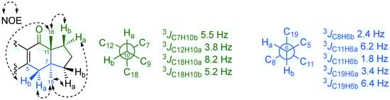 Experimental 3JCH and NOE correlations observed in the hydrindane skeleton of 1b.