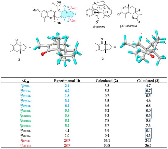 Experimental 1JCC and 3JCH values in 1b extracted from an IPAP-HSQMBC used in the J-based configurational analysis vs. DFT-calculated 1JCC and 3JCH (GIAO/OLYP/Def2TZV//B3LYP/6-31G(d) gas phase) values in silico models 2 and 3. Several 1JCC were measured from a 2D J-modulated ADEQUATE experiment. Santonin and strychnine were used as tests. Strongly deviating couplings allowing the assignment of relative configuration are boxed. All vales are expressed in Hz.