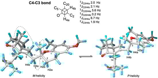Trying to establish the relative configuration at C3, we followed the iJ/DP4 protocol of Daranas, Sarotti et al., involving a conformational search within a 5-kcal/mol interval, and then calculated the theoretical chemical shifts at the B3LYP/6-31G(d,p) level [36,37,38]. Contrasting calculated vs. experimental chemical shifts gave rise to a better DP4 score for the (3R*,7S*,11R*)-1b diastereoisomer (C/DP4: 94.25%, H/DP4: 100%). Next, 3JC2H4a = 2.0 Hz, 3JC2H4b = 2.1 Hz, 3JC20H4a = 5.6 Hz, 3JC20H4b = 0.2 Hz, ǀ2JC3H4aǀ = 6.7 Hz, and ǀ2JC3H4bǀ = 1.9 Hz from IPAP-HSQMBC experiments (see Newman projection on Figure 4) were read into the application of the iJ/DP4, implying four dihedral angle restrictions around the C3–C4 bond, to wit: dihedral O-C3-C4-H4b (180 ± 15), dihedral O-C3-C4-H4a (±60 ± 15), dihedral C20-C3-C4-H4a (180 ± 15), and dihedral C20-C3-C4-H4b (±60 ± 15).
