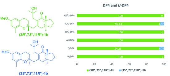 Using iJ/DP4, we fully predicted the (3R*,7S*,11R*)-1b isomer, a slight 95.43% improvement being gained at 13C and a complete one at 1H (see Figure 5). Most populated conformers in both plausible configurations in the DP4 ensembles, generated by an unrestricted conformational search, satisfy the main constraints of chromane helicities, prochiral protons at C4 and C14, and weak hydrogen bonding between OH at C15 and C12 (C=O).