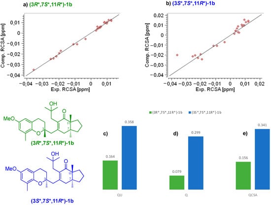 When we corrected for isotropic shifts, a better agreement was achieved between the experimental and back-calculated 13C-RCSAs for (3R*,7S*,11R*)-1b (Q(QCSA) 0.079 (0.156)) as compared to (3S*,7S*,11R*)-1b (Q(QCSA) 0.299 (0.341)) (Figure 6a,d,e). Furthermore, a relative difference in Q between both diastereomers was increased (ΔQu = 0.19; ΔQ = 0.22) (Figure 6c,d).