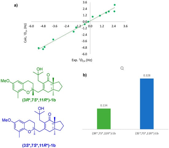 RDC fitting curve of (3R*,7S*,11R*)-1b (a) and Q factor found for (3R*,7S*,11R*)-1b (green) and (3S*,7S*,11R*)-1b (blue) (b).