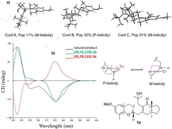 Absolute configuration of 1b. Finally, we resorted to chiroptical methods (ECD/OR) to assign the absolute configuration (AC) of 1b. We used the empirical chromane helicity rule [47,48] and compared the experimental chiroptical data with predicted ECD/ORD from ab initio time-dependent DFT (TD-DFT). Currently, chiroptical methodologies associated with quantum chemical calculations are some of the most powerful tools for elucidating stereochemistry and examining even minute changes in the geometry of chiral molecules [49,50,51]. Determining the AC of this framework is also possible by following a chromane helicity rule [47,48]. This rule, established by Crabbé and related to 1Lb excitation of the chromophore, relates the sign of the ECD band with the helicity of the trisubstituted dihydropyran ring [48] at around 270–290 nm. An extra requirement for the application of the rule is that the largest substituent at the C3 carbon atom should favorably occupy an equatorial position. This rule was exhaustively studied in 2014 by Górecki and Frelek, who revised both the scope and limitations of comparing the experimental ECD spectra with those simulated by TD-DFT, and should, therefore, be used with great caution [52,53]. In our case, following Crabbé’s rule, the ECD curve strongly depends on the population ratio of 1b conformers with the methyl group at C3 either in axial or equatorial positions.