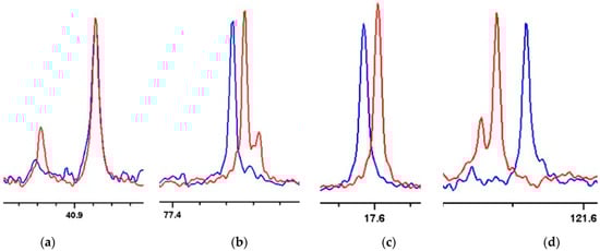 Some significant variations in carbon chemical shifts in the oriented media were observed (see Figure 9). A certain amount of isotropic analyte was always detected because the gel in the compression device did not completely fill the entire sample space, even under maximum compression [68]. As before, the isotropic signals were easily distinguishable from their anisotropic counterparts, as their intensities diminished upon compression.