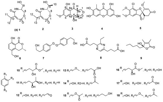 Marine sponge derived fungi featured with easy culture and efficient productivity have been proven to be a prolific source of structurally diverse and novelty secondary metabolites [1]. Plenty of new secondary metabolites of sponge-derived fungi have been discovered with striking bioactive properties such as antifungal [2], antiviral [3], antioxidant [4], and cytotoxic [5] properties; meanwhile, their structures are diverse including polyketones, terpenes, and alkaloids [6,7].