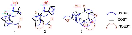 Key COSY, HMBC, and NOESY correlations of 1–3.