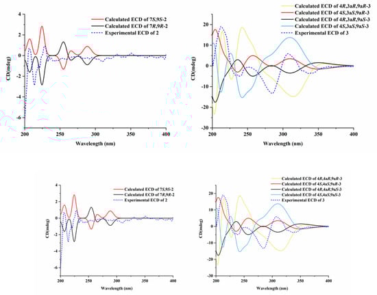 The Molecular Merck force field (MMFF) and density functional theory (DFT)/TDDFT calculations of 2 and 3 were performed with the Spartan’14 and Gaussian 09 software, respectively, using default grids and convergence criteria. A MMFF conformational search generated low energy conformers with a Boltzmann population of over 5%, which were subjected to geometry optimization using the DFT method at the B3LYP/6-311G* level in MeOH using the IEFPCM model. The overall theoretical calculation of the ECD was conducted in MeOH using TDDFT at the B3LYP/6-311G* level for the stable conformers of 2 and 3. The ECD spectra of the different conformers were generated using the Multiwfn [34] with a half-bandwidth of 0.2–0.4 eV, according to the Boltzmann-calculated contribution of each conformer after the UV correction.