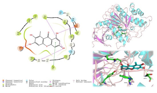 All the isolated compounds were assessed for their enzyme inhibitory activities against acetylcholinesterase (AChE). Compounds 3, 4, 6, 8, 11, and 15 exhibited obvious inhibition against AChE with an inhibitory rate more than 80% at 50 μg/mL, comparative to the positive control tacrine with an inhibitory rate 83.7% at 50 μg/mL (Table 2). Among them, 2,3,6,8-tetrahydroxy-1-methylxanthone (4) showed the strongest activity relatively, with an inhibitory rate 86% at 50 μg/mL. Subsequently, molecular docking analysis was conducted to investigate the binding modes between active compounds and AChE. Compounds 2–12, 15, and 17 appeared to interact with AChE protein (PDB ID: 4EY7) perfectly with the docking scores from −6.213 to −9.383 (Table 2) (the positive ligand E20 with the docking score −12.482, and tacrine with the docking score −9.965). As shown in Figure 4, phenolic hydroxy groups of 4 (the docking score −9.383) formed four hydrogen bonds with the active site residues GLU 202, TYR 133, GLY 120, and ASP 74. Additionally, the aromatic ring of 4 formed a π-π stacking interaction with TRP 86.