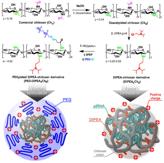 Recently, our research team has shown that the combination of chitosan with DIPEA groups is a promising alternative for the development of siRNA nanocarriers. However, the best transfection efficiencies were still centered at low pH values due to the higher degrees of ionization of the derivatives [16]. Thus, this study proposed to better explore the effect of the degree of ionization of the polycations on the physicochemical and biological properties of the nanocarrier by studying a higher variation of DIPEA grafts (5–55%) on a highly deacetylated chitosan, as shown in Figure 1. The derivatives were prepared using a highly deacetylated and low molecular weight (100 kDa) chitosan sample and further grafted with low densities of PEG (2 kDa) chains to improve the colloidal and biological performance of nanovectors at physiological conditions, i.e., pH 7.4 and ionic strength of 150 mmol L−1. The nanocarriers were prepared by the coacervation process and their physicochemical characteristics were evaluated and discussed, focusing on the attributes favorable to transfection, such as small size, positive surface charge, and high biological stability. Finally, the siRNA nanocarriers were subjected to in vitro studies to evaluate their cytotoxicity, cell internalization, and transfection efficiency by the knockdown of GFP and the tumor necrosis factor alpha (TNFα) in HeLa cells and RAW 264.7 macrophages, respectively.