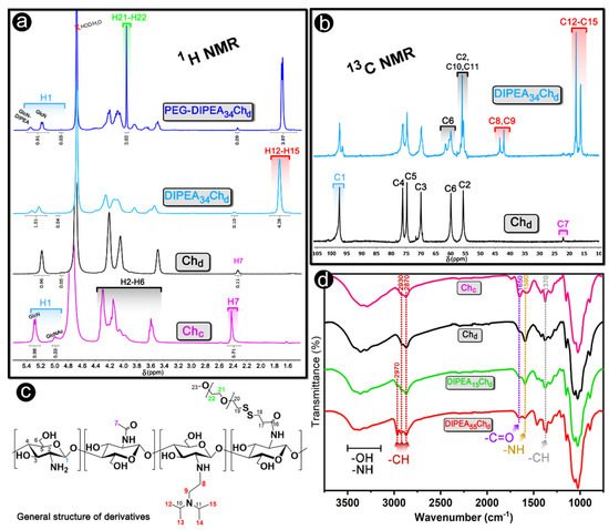 (a) Representative 1H NMR and (b) 13C NMR spectra of chitosan and its DIPEA/PEG derivatives associated with (c) the general chemical structure of polymers and (d) FTIR characterization of chitosan and derivatives.