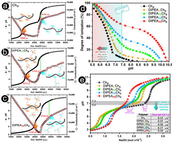 (a–c) Potentiometric and conductimetric titration of chitosan and derivatives. (d) Degree of ionization and (e) Buffer capacity of polymers as a function of pH.