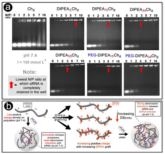 (a) Gel electrophoresis of polymer/siRNA nanoparticles at an increasing N/P ratio in phosphate buffer (pH 7.4 and I = 150 mmol L−1). The red arrows indicate the complete complexation of siRNA. (b) Schematic representation of the effect of DIPEA grafting on chitosan to formulate the siRNA nanocarriers.
