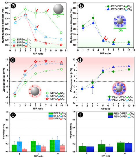 (a,b) Hydrodynamic diameter, (c,d) Zeta potential, and (e,f) polydispersity of nanoparticles assembled with DIPEA (left) and DIPEA/PEG (right) derivatives with siRNA at an increasing N/P ratio in phosphate buffer (pH 7.4 and I = 150 mmol L−1). The red arrows (a,b) indicate some changes in the size of PEG/DIPEA-nanoparticles compared to non-PEGylated vectors.