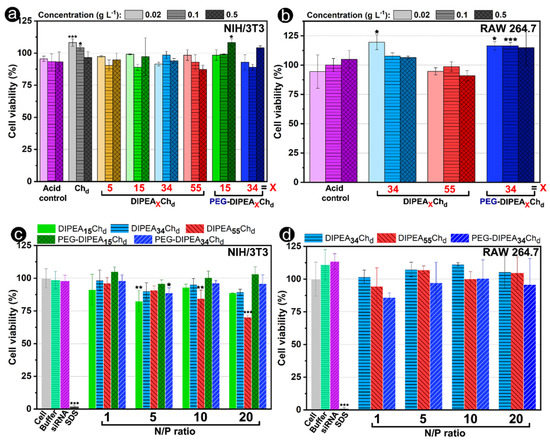 Viability of (left) NIH/3T3 and (right) RAW 264.7 cells in (a,b) the presence of increasing polymer concentration and (c,d) in the presence of nanocarriers formulated at variated N/P ratios. Cell viability was evaluated by an MTS assay and expressed by comparison with the non-treated cells (100% of viability). Statistical analysis was performed using the unpaired Student test (at a significance level of 0.05) and comparisons are shown between (a,b) the same concentrations of acid controls and polymers and between (c,d) the non-treated cells (cell) and the cells treated by nanoparticles/other controls. * p < 0.05, ** p < 0.01, *** p < 0.001, no symbol = no significant differences between the means.