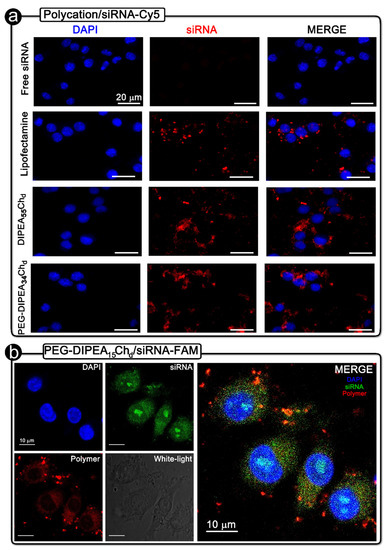 Confocal microscopy images of RAW 264.7 macrophages after their treatment (a) with siRNA-Cy5 only or carried by the lipofectamine or by the DIPEA-derivatives, (b) and with nanocarriers formulated by siRNA-FAM and RITC/PEG-DIPEA15Chd derivative. All nanocarriers were formulated at N/P ratio 10 under physiological conditions (pH 7.4 and I = 150 mmol L−1).