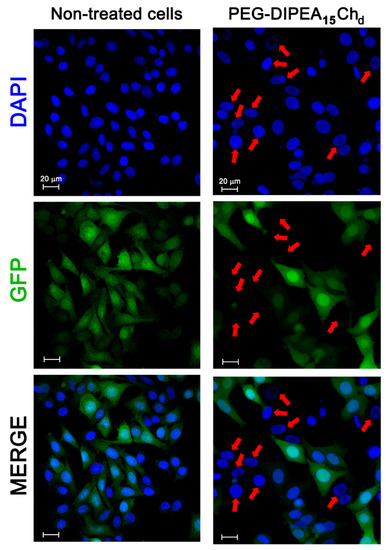 Confocal microscopy images of HeLa-GFP cells stained by DAPI after no vector treatment (non-treated cells) and after their treatment with PEG-DIPEA15Chd nanoparticles loaded with siRNA anti-GFP at N/P ratio 10 (pH 7.4 and I = 150 mmol L−1). The red arrows indicate cells at which there was no GFP observed. Scale bar: 20 μm.