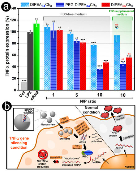 The nanoparticles formulated with the most substituted derivatives (DIPEA34Chd and DIPEA55Chd) and that have exhibited the most promising physicochemical properties, i.e., improved siRNA condensation, small sizes, positive surface, and enhanced colloidal stability, were tested for their ability to knockdown the TNFα cytokine (Figure 10a). The expression of TNFα cytokine by RAW 264.7 cells was evaluated using the ELISA assay and compared with cells treated with LPS only (100% of TNFα expression). In general, the results showed that gene knockdown is dependent on the N/P ratio, DSDIPEA, and the PEG grafting. The transfection efficiency mediated by non-PEGylated derivatives (DIPEA34Chd and DIPEA55Chd) was greatly dependent on the N/P ratio and a significant knockdown of TNFα was observed only for N/P ≥ 5.0. These results correlate well with the physicochemical properties observed for nanoparticles, which exhibited positive zeta potentials of about +10 mV and Dh values in the range of 100–250 nm only for N/P ratios higher than 5 (Figure 5). In addition, it is noteworthy that, although the physicochemical properties of the nanoparticles were mainly influenced by the degree of ionization of the polycations (as shown in the sections above), all DIPEA-chitosans showed buffering capacity at endosomal pH range (Figure 3), thus the increase of polymer concentration to formulate the nanocarriers at high N/P ratios may favor the endosomal escape of the nanovectors by the proton sponge hypothesis, since the buffering capacity is proportional to the non- protonated amino groups at neutral pH. At N/P ratio 10, the increase in DSDIPEA content, from 34 to 55%, promoted a decrease of about 30% in TNFα expression. Besides, PEGylation provided a significant improvement in transfection efficiency of DIPEA34Chd and the knockdown was increased from 25% to 65% (N/P ratio 10), suggesting that both the decrease in size and the increase in colloidal stability were responsible for the higher efficiency of the PEG-DIPEA34Chd nanoparticles. Moreover, in the presence of the FBS proteins, PEG-DIPEA34Chd and DIPEA55Chd derivatives built siRNA nanoparticles that were able to reduce TNFα expression by 50–65% when compared to LPS-treated cells only, which is consistent with their resistance to protein adsorption displayed in Figure 6, and with their significant cell uptake observed by confocal microscopy (Figure 8). On balance, these results have confirmed that chitosan can be associated with DIPEA and PEG groups for formulating promising siRNA nanocarriers at physiological conditions (pH 7.4, I = 150 mmol L−1) that are worthy of evaluation in in vivo studies.