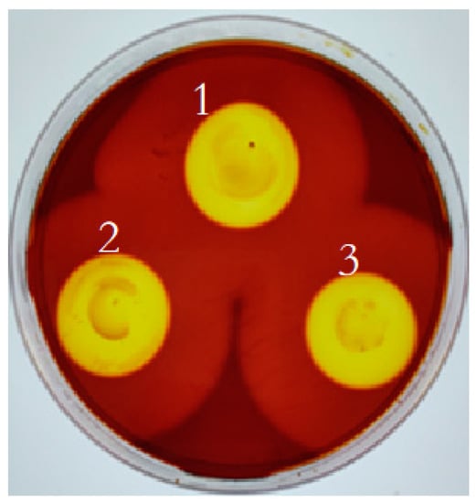 A 5 μL aliquot from a culture of Vibrio sp. Ni1 grown in liquid Luria-Bertani (LB) medium, was transferred to an alginate plate containing 1% (w/v) sodium alginate, 0.2% (w/v) glucose, 0.3% (w/v) NaCl, 0.2% (w/v) NaNO3, 0.05% (w/v) MgSO4·7H2O, 0.1% (w/v) K2HPO4, 0.01% (w/v) CaCl2, and 1% (w/v) agar, pH 7.5. The plate was incubated at 28 °C for 48 h. The plate was stained with 1 mL Lugol’s reagent (5% (w/v) I2, 10% (w/v) KI) for 1 min [33]. The plate was washed with deionized water and observed.