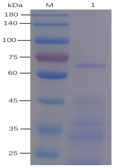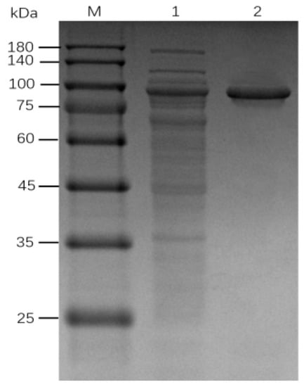 The E. coli cells harboring the recombinant plasmid pET32a-algB were cultured at 37 °C in liquid LB medium with 100 μg/mL ampicillin until OD600 reached about 0.6. Gene expression was induced with the addition of isopropyl-β-d-thiogalactoside (IPTG) to a final concentration of 0.8 mmol/L and then grown at 20 °C for 24 h. The cells were harvested by centrifugation 8000 r/min, 5 min, at 4 °C, then suspended in 0.05 mol/L Tris-HCl buffer (pH 7.4) to concentrate 1/10 volume. The cells were disrupted by ultrasonication. The lysate was harvested by centrifugation 10,000× g, 30 min, at 4 °C. The supernatant was filtered with 0.22 micrometer cellulose acetate membrane before passage through a Ni-NTA Sepharose column (GE, Boston, MA, USA). The column was washed with washing buffer (0.05 mol/L Tris-HCl buffer (pH 7.5), 0.5 mol/L NaCl, 20 mmol/L imidazole), and the recombinant alginate lyase AlgB was eluted with elution buffer (0.05 mol/L Tris-HCl buffer (pH 7.5), 0.5 mol/L NaCl, 0.3 mol/L imidazole). The eluate was dialyzed in 0.05 mol/L Tris-HCl buffer (pH 7.5) overnight and analyzed by 12% SDS-PAGE. The protein concentration was measured by the Bradford method.