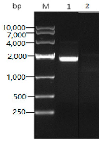 The PCR amplification of full-length algB gene. Lane M: DNA Marker; Lane 1: The product of full-length algB gene; Lane2: negative control.