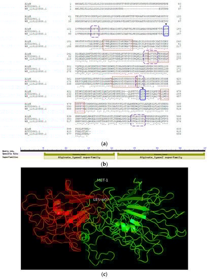 AlgB is classified in the polysaccharide lyase family 7 (PL7). Conserved domain analysis revealed two structural domains in AlgB (Figure 4b). Each structural domain has a predicted catalytic domain. Alginate lyases in PL7 contain three highly conserved motifs, R*E*R, Q(I/V)H, Y*KAG*Y*Q, which form the active site and play an important role in substrate binding and catalysis [23,24]. These conserved motifs also exist in each of the two structural domains in AlgB (RSEVR, QIH, YFKAGVYNQ; RSELR, QIH, YFKAGIYPH). The predicted three-dimensional structure of AlgB was generated by LOMETS (Figure 4c). The typical protein structure of PL7 is a single domain β- jelly roll [3,23]. The first structural domain is residues 78–310, the second structural domain is residues 319–606. These two structural domains connect closely with an octapeptide linking region. It is rare that PL7 alginate lyases have two catalytic domains [25,26].