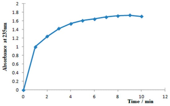 To characterize the recombinant enzyme, the algB gene was cloned into the expression vector pET32a (+) and transformed to E. coli BL21. The fusion proteins of AlgB were soluble when expressed in host cells and purified by nickel affinity chromatography. Since the mass of the fusion tag protein (TrxA) is approximately 20 kDa, the recombinant AlgB is about 88 kDa. The SDS-PAGE analysis is consistent with the prediction (Figure 5). The activity of purified AlgB was measured (Figure 6). Along with the increase in time, the absorption at λ235 was enhanced rapidly within 1 min and, subsequently, increased slowly. It suggested that AlgB shows the activity of alginate lyase.