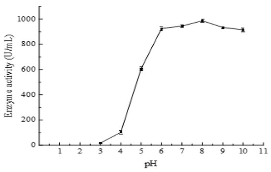 The effect of pH on the enzyme activity of AlgB. Reactions were conducted at 40 °C for 30 min in 50 mmol/L Tris-HCl buffer with a pH range 3–10. The data represent the mean of three experimental repeats with SD < 5%.