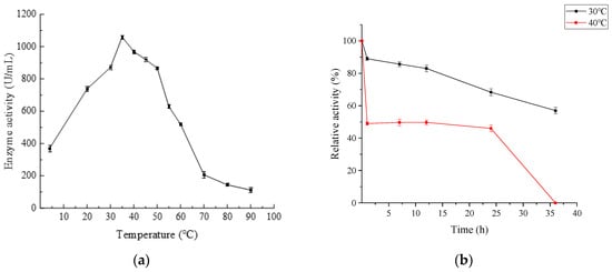 The optimal temperature for AlgB was 35 °C and the highest activity was 1059 U/mL (Figure 8a). More than 50% of the maximum activity was measured at a wide temperature range 20–60 °C. The activity of AlgB has sharply decreased over 60 °C. Even at 4 °C, the activity of AlgB was measured 35% maximum. The enzyme retained more than 50% of the highest activity after being incubated at 30 °C for 36 h, and the enzyme retained more than 40% of the highest activity after being incubated at 40 °C for 24 h (Figure 8b). The results show that the activity of AlgB is stable at 30–40 °C. The optimal temperature of AlgB was similar to Aly-IV from Vibrio sp. QD-5 [31].