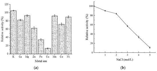The activity of AlgB was inhibited by 10 mmol/L Mg2+, Ca2+, Mn2+, Co2+, Ni2+, Zn2+; furthermore, strongly inhibited by Fe2+ and Cu2+. Among the metal ions, only K+ displayed slight activation of enzyme activity (Figure 9a). The enzyme retained more than 50% of the highest activity in 1–2 mol/L NaCl (Figure 9b). Enhancing the concentration of NaCl to more than 3 mol/L, the activity sharply decreases. These results suggested that AlgB has a good tolerance to NaCl. Previous investigations report that many metal ions can increase the enzyme activity, such as Mg2+ and Ca2+ (Table 3). The effect of metal ion on AlgB was similar to Aly-IV except for Mg2+ (Table 3). With the same concentration, Mg2+ strongly activates Aly-IV but slightly inhibits AlgB.