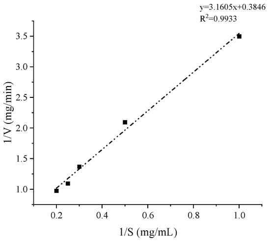 Lineweaver-Burke plots for the degradation of alginate by AlgB. Enzyme activity was determined at different alginate concentration of 1.0–5.0 mg/mL, 35 °C and 50 mmol/L Tris-HCl buffer (pH 8.0) according to Nelson method. The data represents the mean of three experimental repeats with SD ≤ 5%.