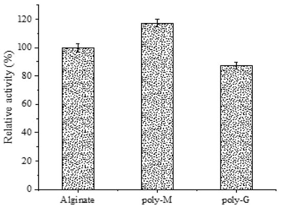 Substrate specificity of AlgB. The concentration of substrate was 1 mg/mL. The activity measured in 35 °C and 50 mmol/L Tris-HCl buffer (pH 8.0) using sodium alginate as substrate was taken as 100%. The data represent the mean of three experimental repeats with SD ≤ 5%.