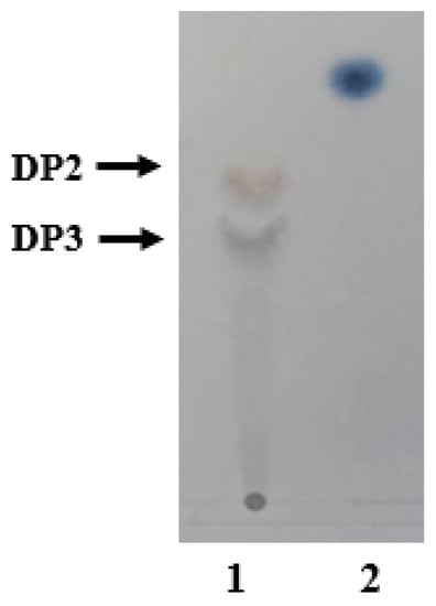 TLC analysis of degradation products of AlgB towards sodium alginate. Lane 1, the enzymatic products after reaction with AlgB for 12 h; Lane 2, mannuronic acid.