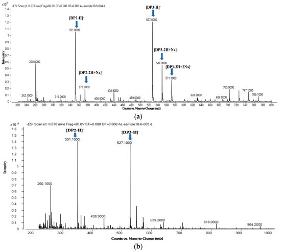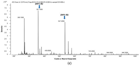 ESI−Q−TOF analyses of the end products of AlgB. The enzymatic products were harvested after AlgB incubation for 12 h. (a) sodium alginate, (b) polyM, and (c) polyG. DP indicates the degree of depolymerization of oligosaccharides released from the substrate.