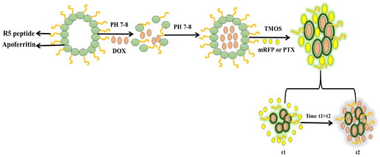 The synthesis of diatom nanoparticles (DNPs) with a functionalized nanocarrier can replace synthetic NPs for their application as an anticancer DDS. Three different surfactant- templated biosilica NPs have been synthesized—Triton X-100 (Triton@MSNs, nonionic surfactant), sodium dodecylbenzene sulfate (SDBS@MSNs, anionic surfactant), and cetyltrimethylammonium bromide (CTAB@MSNs, cationic surfactant)—as carriers of an anticancer drug CPT-11 and their anticancer activities were determined and compared with free drug. The cytotoxic activities are in the order of CTAB@MSNs > SDBS@MSNs > Triton@MSNs. The cationic CTAB@MSNs could have interacted with silanol groups on the silica surface and the drug for more focused actions to produce higher anticancer activities than the other surfactants and the free drug [87]. The anticancer drug, DOX, loaded onto MSNs via a physical absorption process, has been combined with cancer-targeting polypeptide 2,3-dimethyl anhydride (DTCPP) and a therapy peptide 2,3-dimethyl anhydride (DTPP). The pH-sensitive DOX@MSN-ss-DTPP&DTCPP NPs drug carriers exhibit the release behavior influenced by an acidic pH and glutathione (GSH). A high cytotoxicity towards HeLa cells is observed after 48 h treatment where the release of DOX and the therapy peptide stimulates apoptosis, targeting the cell nucleus and mitochondria [88]. A study on the controlled-release mechanism of the drug shows direct correlation of the decomposition of the silica nanostructure with the drug release from the porous structure. This diatom biosilica is biodegradable and cost-effective as compared to the synthetic counterparts, for theranostic applications, and the delivery of chemotherapeutics [89]. Curcumin (CUR) and 5-fluorouracil (5FU) loaded onto the MSNs with magnetic bacterial iron oxide nanowires, and further encapsulated in pH-sensitive hypromellose acetate succinate microspheres using droplet-based microfluidics, have exhibited synergistic effects on SW480 colon adenocarcinoma cells [90]. An advanced dual DDS (dDDS), based on R5 peptide-fused ferritin (R5FT) with biosilica deposition on the ferritin surface, has been developed to overcome the limitation of different physicochemical properties of the different drugs during combination drug therapy. DOX is loaded into the core inside (the ferritin cage), and the monomeric red fluorescent protein (mRFP) or paclitaxel (PTX) is retained by the biosilica matrix (Figure 6). The mRFP or PTX exhibits short-term release, while DOX shows a sustained release. The compartment-based and rate-controlled dDDS with the PTX-DOX combination attains a two-fold higher cytotoxicity than the single DOX [91].