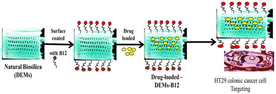 Natural biosilica “DEMs” coated with B12 and loaded with poorly water-soluble drugs. The loaded micro-shuttles target and interact with HT29 colon cancer cells before releasing the drug [99] (modified with permission, Copyright © 2018, Royal Society of Chemistry).