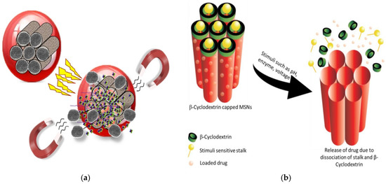Stimuli-responsive drug delivery based on MSNs—(a) Release of drug from β-CD-capped-MSNs in response to endogenous stimuli (reproduced from [67] under Creative Commons Attribution (CC BY) license); (b) The drug is loaded into the mesopore ducts. The pore openings are then closed with nanocaps to block the early release of the cargo. At the target site, the stimulation removes the gatekeepers, allowing the trapped drug to be released (reproduced from [11] under Creative Commons Attribution (CC BY) license).