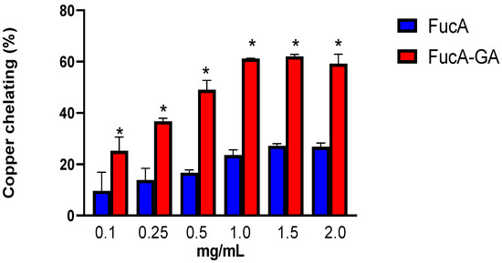 Figure 2. Copper chelating activity of polysaccharides. * indicates significant difference between the FucA and FucA-GA samples at the same concentration (p < 0.05). Statistical analysis was performed using one-way ANOVA.
