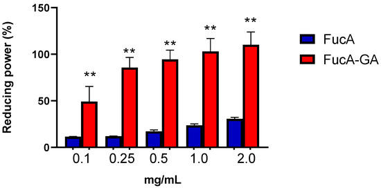 Figure 4. Reducing power. ** indicates a significant difference between the FucA and FucA-GA (p < 0.0001).